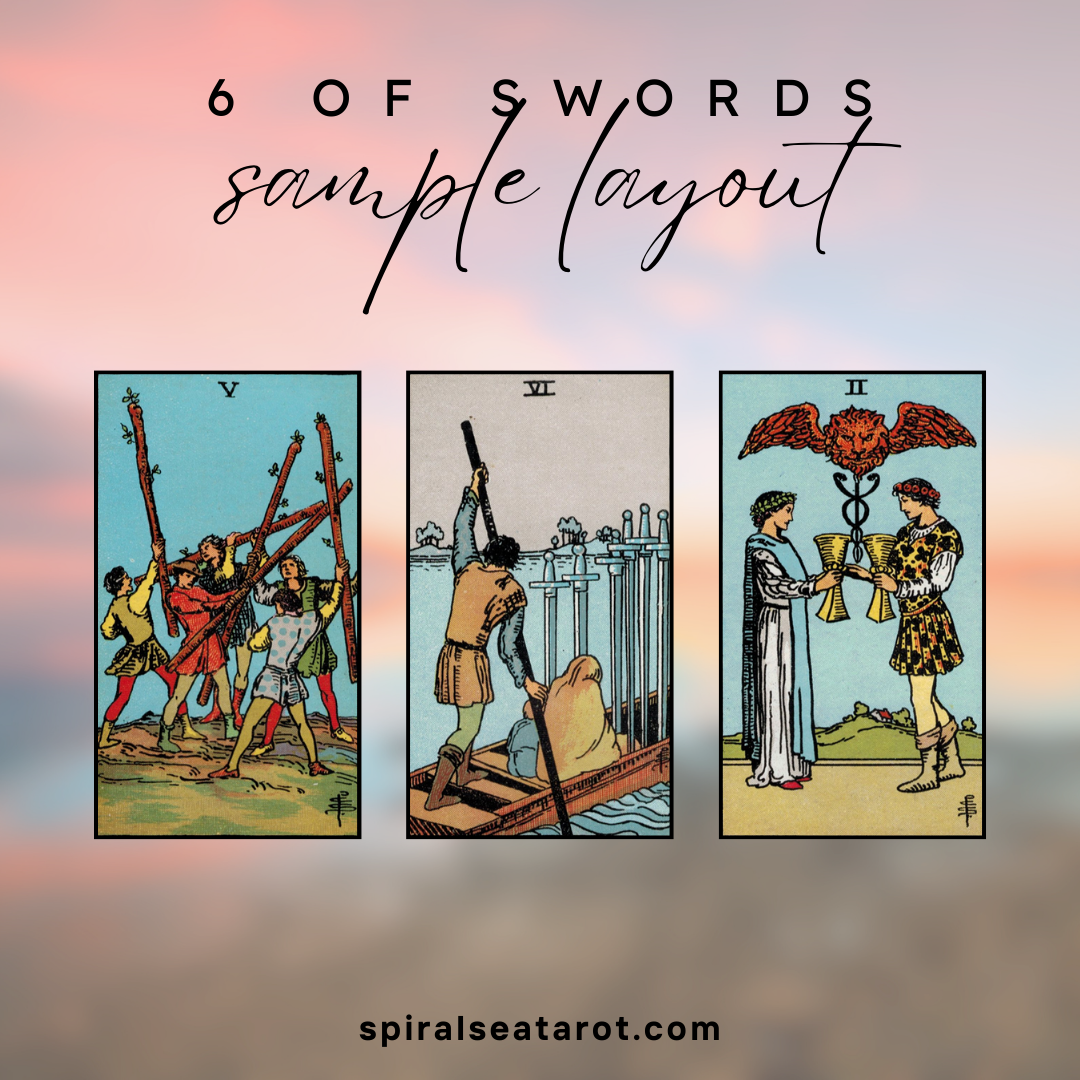 What you should have now are two cards. One to represent the current situation that you’d like to move away from, and one to represent where you’d prefer to be. With those two cards in front of you, place the 6 of Swords between them. Your arrangement should look similar to the image below. I’ve also included a sample layout so you can really get the idea.