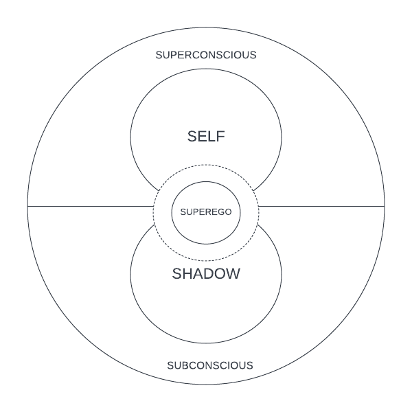 When we observe the diagram above, we can see that the overall psyche – the main circle that encompasses all its other components – has been divided into two halves. The lower half is what we call the subconscious, while the upper half is known as the superconscious. Together, these two halves comprise what Jung referred to as the unconscious – the combined totality of all the elements of the psyche that are typically inaccessible to our everyday, conscious awareness, represented by the small circle at the center of our diagram.